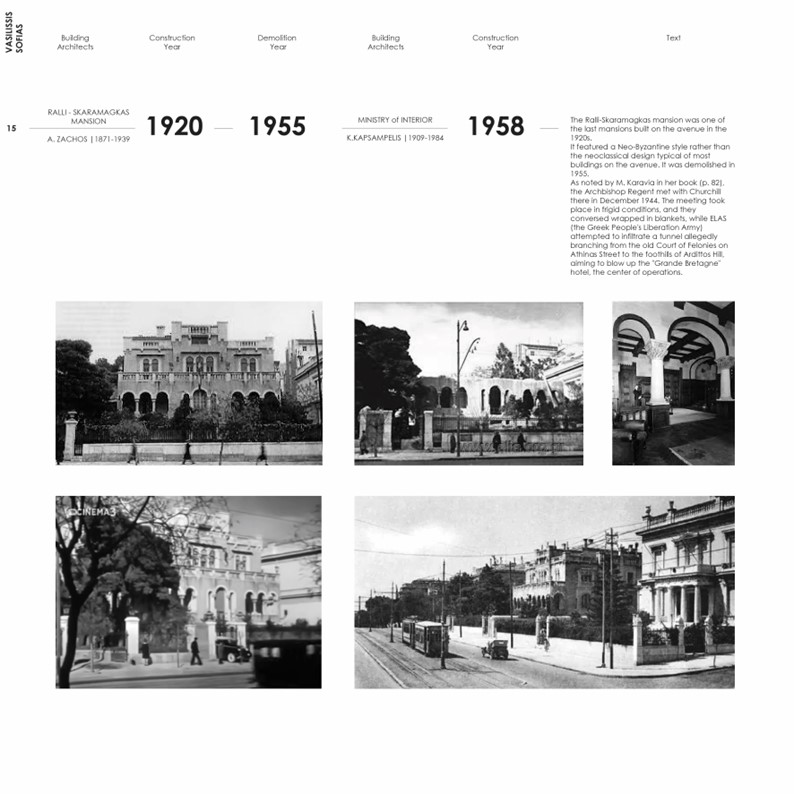 It’s built in the site of Ralli-Skaramagkas mansion built from A.Zachos architect and was one of the last mansions built on the avenue in the 1920s. It featured a Neo-Byzantine style rather than the neoclassical design typical of most buildings on the avenue. It was demolished in 1955.