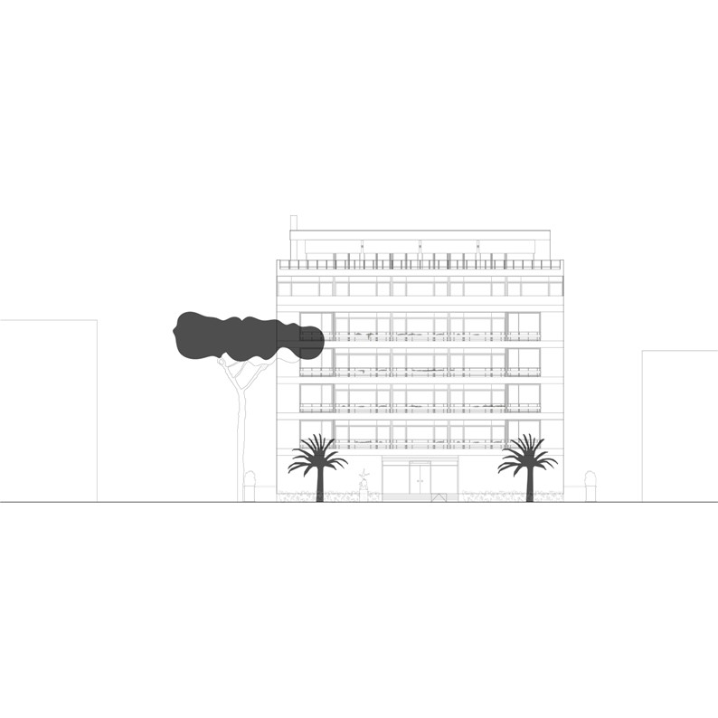 The facades are designed with an intent to convey calmness referencing outdated Neoclassicism. This is achieved through the emphasis on symmetrical axes and the use of semi-open spaces (loggias). The building combines the geometric simplicity of Modernism with classical elements of symmetry and organization. It possesses a strong sense of monumentality, enhanced by clean lines, cubic volumes and marble cladding.